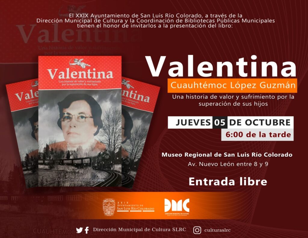 San Luis Río Colorado, (Octubre 04 del 2023).- La Dirección Municipal de Cultura en conjunto con la Coordinación de Bibliotecas Públicas Municipales llevarán a cabo la presentación del libro titulado “Valentina”, del autor Cuauhtémoc López Guzmán el próximo jueves 05 de octubre a las 6:00 pm en el Museo Regional.