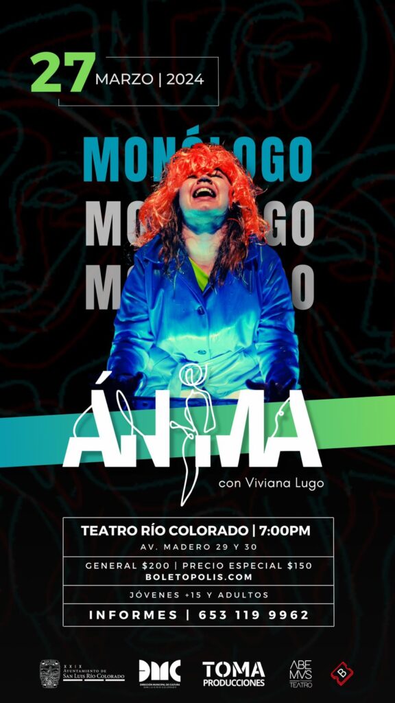 San Luis Río Colorado, Sonora (Marzo 26 del 2024).- Como parte de la promoción de las artes escénicas en la comunidad, TOMA Producciones en coordinación con la Dirección Municipal de Cultura anuncia la presentación de dos monólogos, “Ánima” y “La furia de Nicolás”, que tendrán lugar en el Teatro Río Colorado.