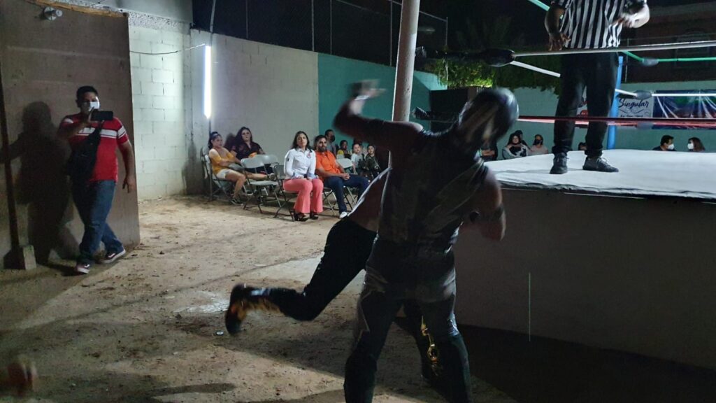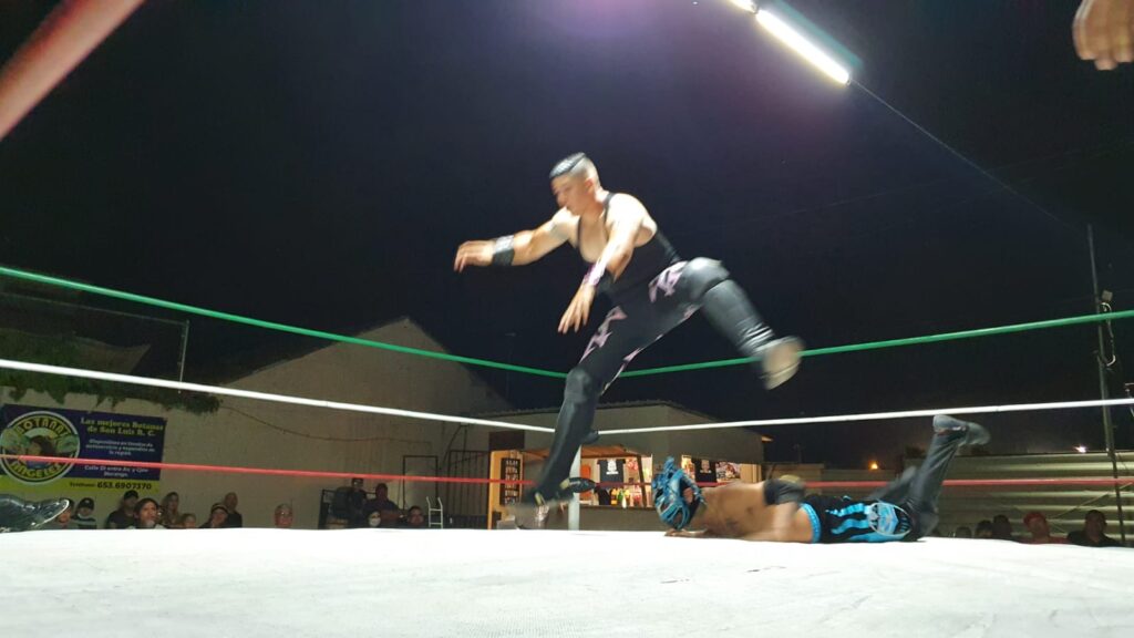 Abrieron la noche los sanluisinos Welder y Singular, ambos jóvenes promesas enmascaradas que se enfrentaron en mano a mano a 1 sola caída, teniendo como referí a El Fronterizo.