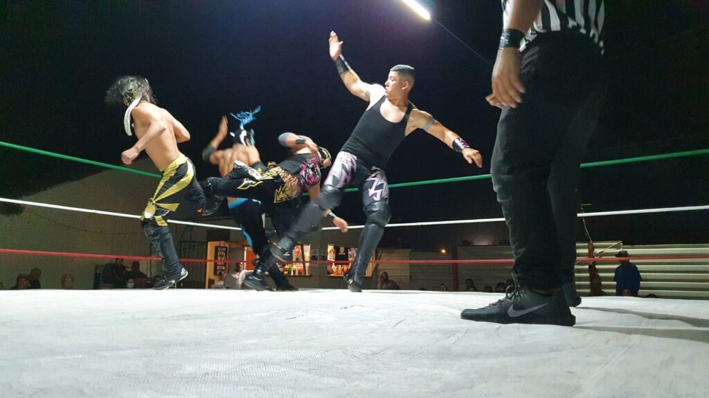 La lucha transcurrió con muchas intervenciones en ambos bandos, observándose vistosos castigos y llaves, así como lances hacia fuera del ring.