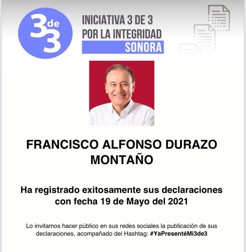 “Felicito esta iniciativa 3 de 3 por la integridad de Sonora. Estos ejercicios son muy importantes, pues obligan a la transparencia y congruencia entre quienes buscamos ocupar un puesto público. Por mi parte, siempre lo he dicho, la transparencia y honestidad ha sido pilar en mi formación”, comentó Durazo.