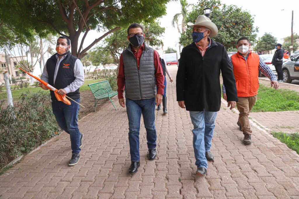 El precandidato inició actividades en la plaza pública de Bácum saludando con distancia y siendo cuidadoso de las medidas establecidas a simpatizantes y vecinos que salieron a su encuentro.