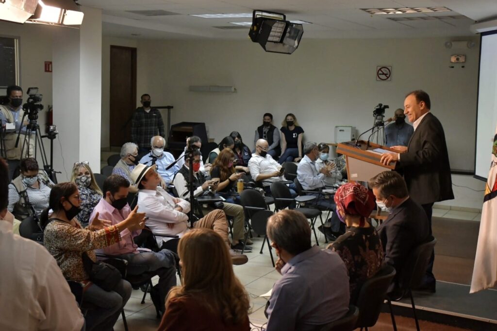 En conferencia de prensa el mandatario estatal, acompañado de los secretarios Álvaro Bracamonte Sierra, de Gobierno; Omar Francisco del Valle Colosio, de Hacienda; y Guadalupe Beatriz Aldaco Encinas, directora general del Instituto Sonorense de Cultura (ISC), detalló que aunque el presupuesto para 2022 es menor al de este año, es responsable porque logrará más para las y los sonorenses.
