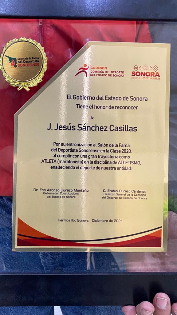 Por su amplia y destacada trayectoria en el mundo del atletismo, el maratonista sanluisino, Jesús Sánchez Casillas, fue entronizado al Salón de la Fama de los Deportistas Sonorenses, un hecho que le fue oficialmente reconocido esta tarde por el alcalde Santos González Yescas.