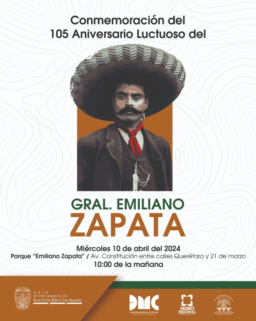 San Luis Río Colorado, Sonora (Abril 08 del 2024).- El 29 Ayuntamiento a través de la Dirección Municipal de Cultura, conmemorarán el 105 Aniversario luctuoso del general Emiliano Zapata Salazar.
