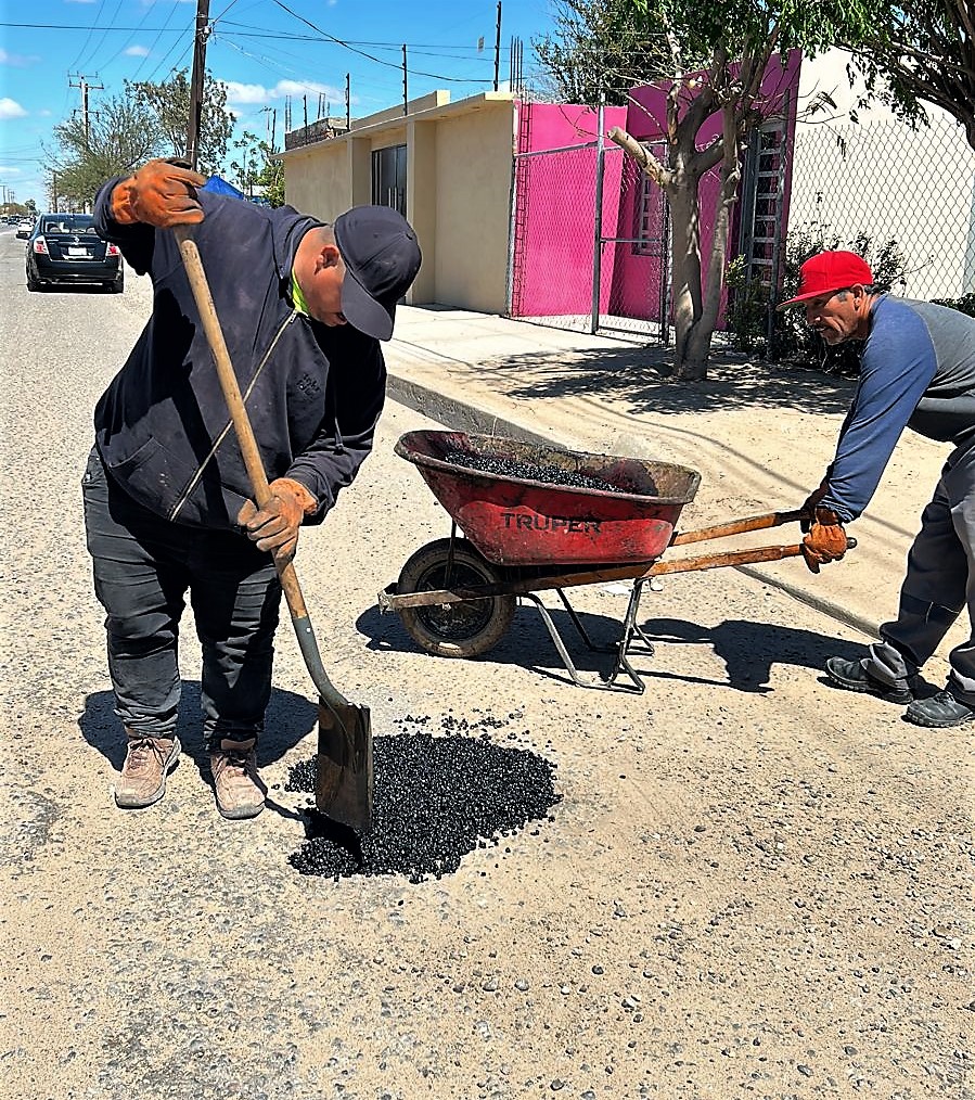 San Luis Río Colorado, Sonora (Marzo 24 de 2023).- El mantenimiento de calles y avenidas es primordial para evitar eventualidades, por lo que la Dirección de Obras y Servicios Públicos Municipales continúa con el programa de bacheo por diferentes calles y avenidas de la ciudad.
