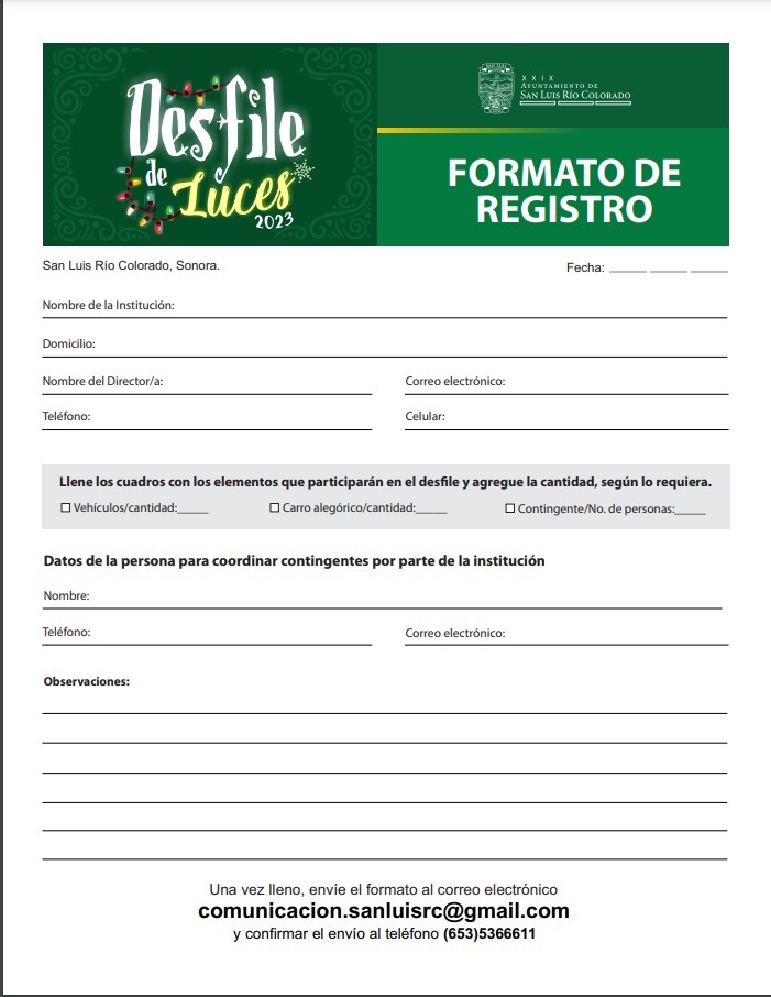 El desfile navideño se llevará a cabo el próximo 8 de diciembre en punto de las 6:00 de la tarde, por lo que los interesados podrán inscribirse mediante la convocatoria que se encuentra ya publicada en redes sociales y hacer llegar el formato de inscripción al correo electrónico: comunicación.sanluisrc@gmail.com confirmando su envío al número (653) 536-6611.