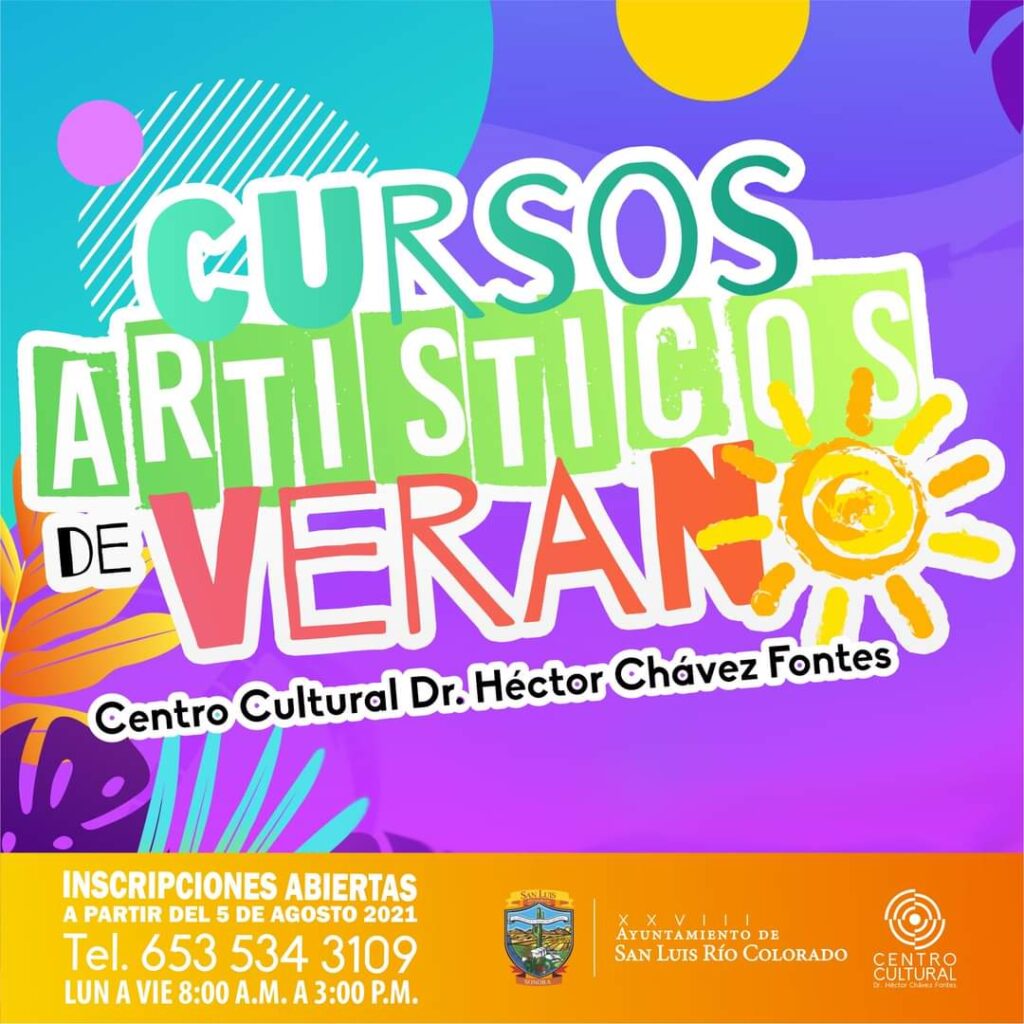 San Luis Río Colorado, Sonora (Agosto 04 de 2021).-Ya se encuentran disponibles los cursos de verano que la dirección del Centro Cultural ofrece a niños, jóvenes y adultos a partir del lunes 9 de agosto y hasta el 2 de septiembre, esto con la intención de que los niños puedan disfrutar de una serie de actividades.