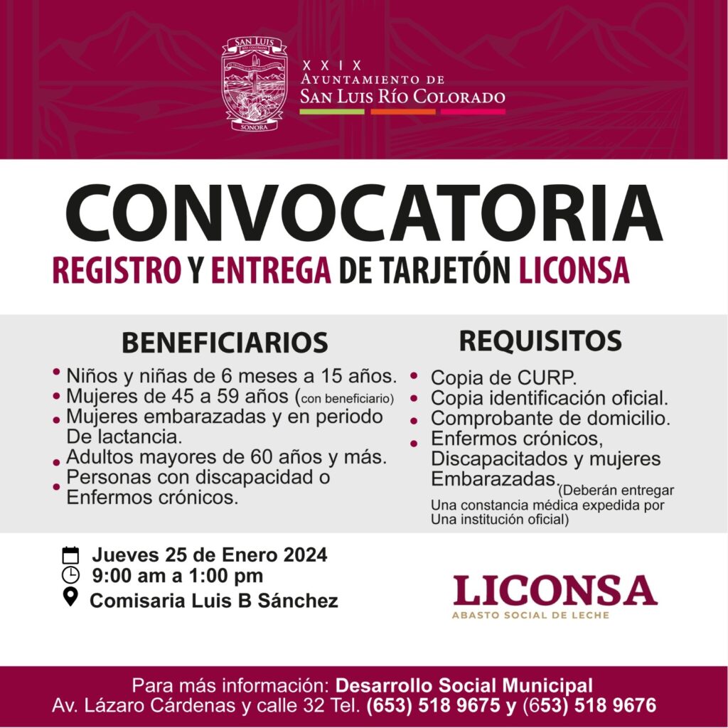 San Luis Río Colorado, Sonora (Enero 24 de 2024).- Un llamado a registrarse al programa alimentario de Leche Liconsa como beneficiario y poder adquirir una gran variedad de nutritivos productos que ofrece el Gobierno Federal, es el que realiza el 29 Ayuntamiento para mañana jueves 25 de enero a las familias de Luis B. Sánchez.