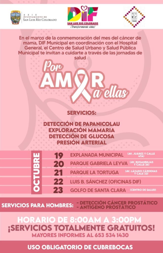 Dentro del marco de la Semana de Concientización por la lucha contra el Cáncer de Mama, la dirección de DIF Municipal en coordinación con Salud Pública Municipal y la Secretaría de Salud exhortan su invitación a mujeres para acudir a la jornada “Por amor a ellas” en prevención de la enfermedad.