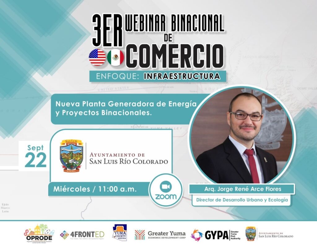 El director de la paramunicipal, Mario Guevara Rodríguez, comentó que este ´webinar´ se estará realizando en colaboración con el condado de Yuma, Arizona y organizaciones como 4FrontED, Greater Yuma Economic Development, Port Authority y Economic Development del Yuma County Government.