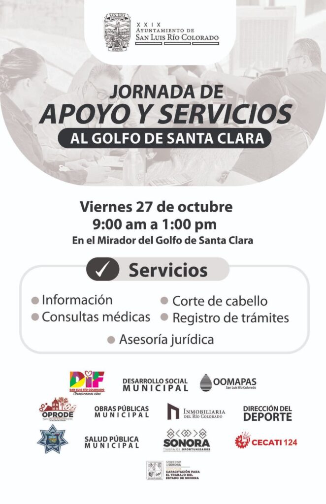 De 9:00 de mañana a 1:00 de la tarde, informó, los residentes podrán solicitar la asistencia de dependencias municipales como Oomapas, Salud Pública, Contraloría, Seguridad Pública, Protección Civil, Deporte, Oprode, Desarrollo Social, DIF, Inmobiliaria Río Colorado, Sindicatura y Desarrollo Urbano, así como participaran módulos de trámites de la Agencia Fiscal, Icatson y Cecati #124.