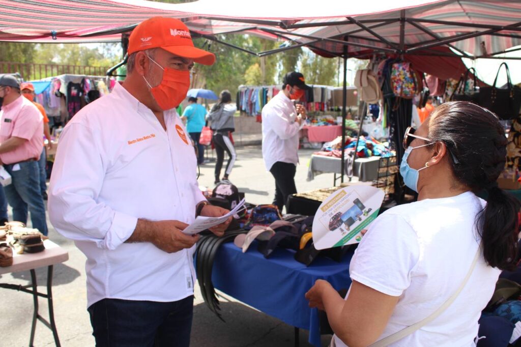 San Luis Río Colorado, a 01 de mayo de 2021.- Gestionar apoyos para emprendedores, es un compromiso que hizo el candidato a la presidencia municipal de San Luis Río Colorado, Alonso Montes Piña, durante un recorrido por el tianguis del Bosque.