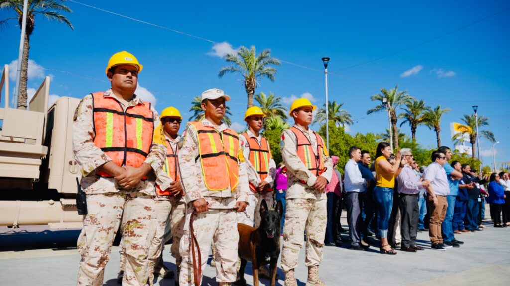 San Luis Río Colorado, Sonora (Septiembre 19 de 2024).- Para conmemorar el Día Nacional de Protección Civil, fecha establecida a raíz de los terremotos de 1985, 2017 y 2022 en el centro del país, autoridades municipales y el Ejército Mexicano participaron esta mañana en el Simulacro Nacional 2024.