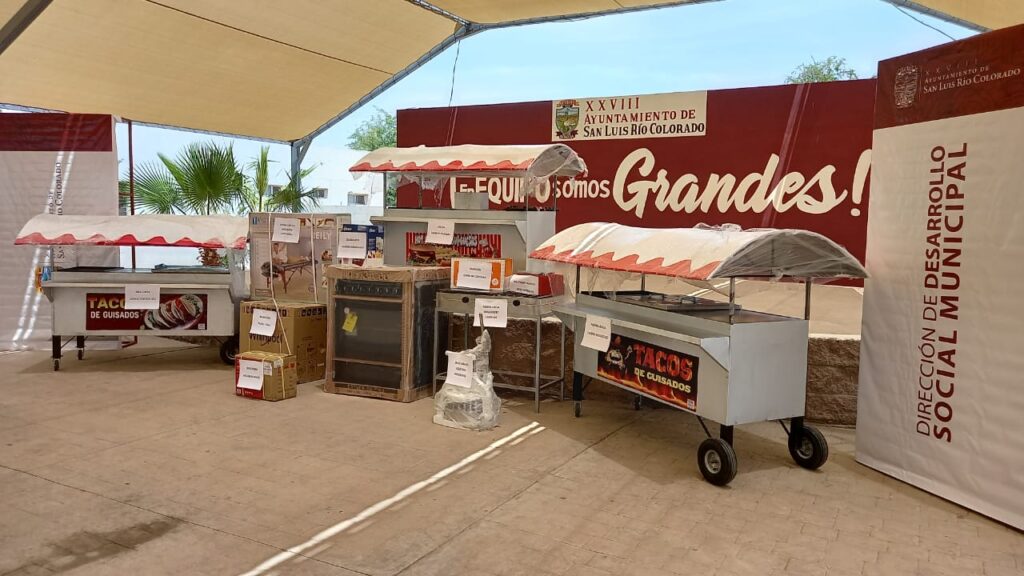 Carretas para hot-dogs, para tacos de guisado, hornos, planchas-quemadores para cocina, maquina duplicadora de llaves, materiales para uñas acrílicas, mesas para masaje, máquina cortadora de masa para tortillería y equipo para barbería entre otros, fue el material entregado este martes.