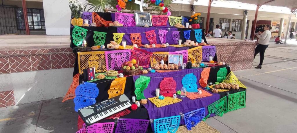 Se ve como alumnos colaboraron con los adornos que conlleva un altar de muertos, que son el papel picado, velas, flores de cempasúchil, la comida favorita, una calavera, sal, pan de muerto y un perro negro.