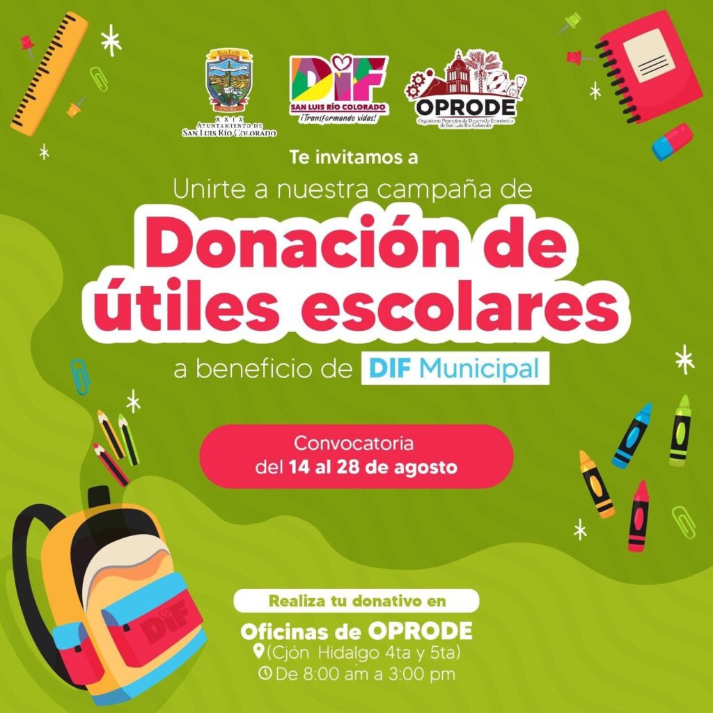 San Luis Río Colorado, Sonora (Agosto 23 de 2023).- Un llamado a donar útiles escolares para apoyar a estudiantes que más lo necesitan, es el que reitera el Organismo Promotor y Desarrollo Económico (Oprode) a empresarios, comerciantes, emprendedores y comunidad en general, cuyo último día de recolección es este lunes 28 de agosto.