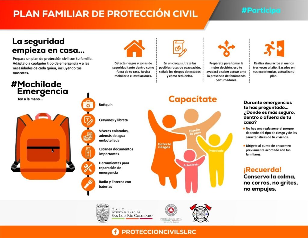 Agregó que en este plan además de saber cómo actuar ante fenómenos naturales, se promueve la organización de una mochila de emergencia, en la que contenga documentos oficiales, alimentos no perecederos, botiquín y otros artículos de supervivencia básica.