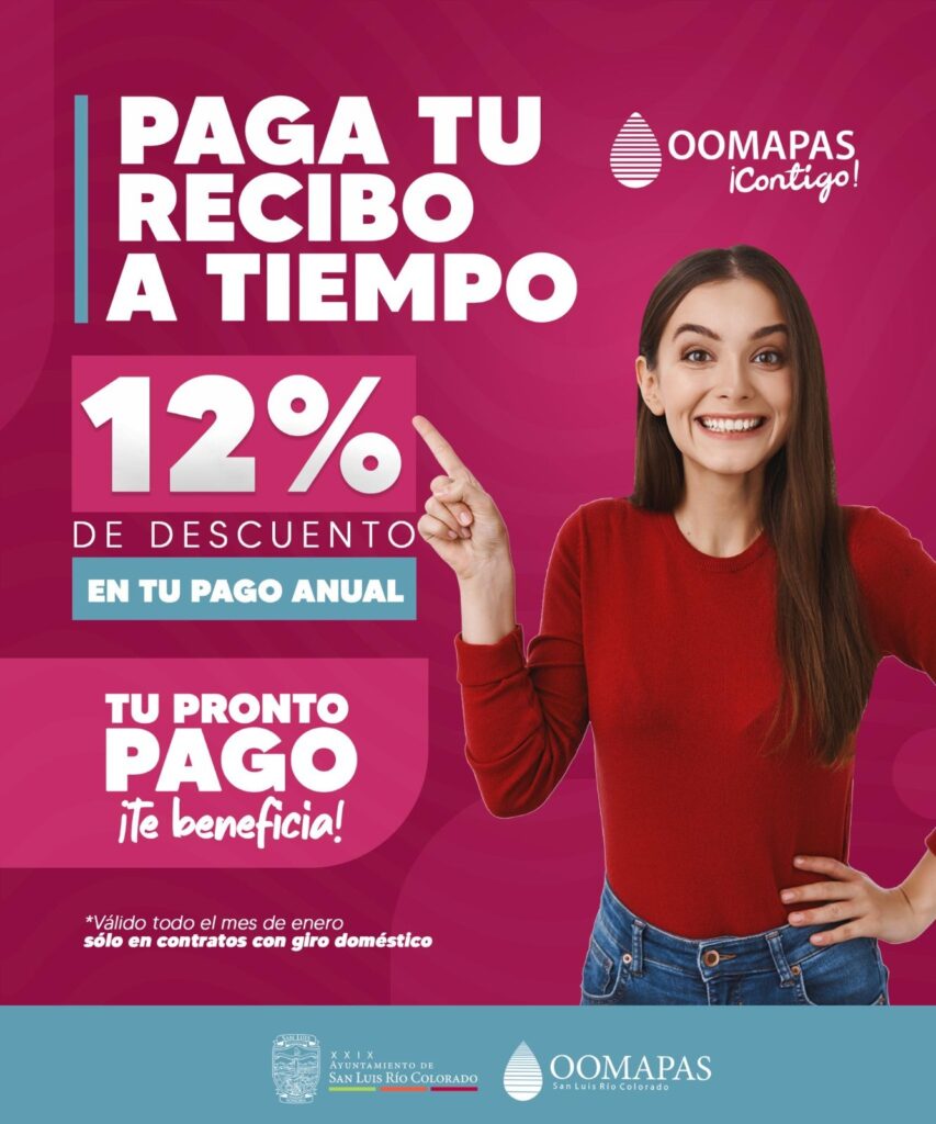 San Luis Río Colorado, Sonora (Enero 30 de 2024).- A dos días de que termine el mes de enero, el Oomapas reitera la invitación a la comunidad a aprovechar los descuentos de pronto pago anual con la campaña “Paga tu recibo a tiempo”.