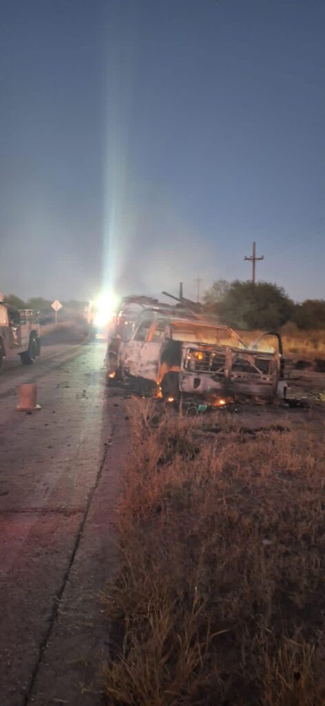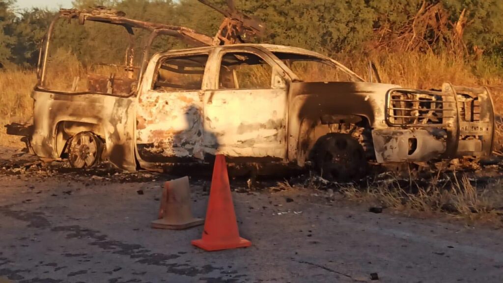 En las imágenes que circulan en redes sociales se pueden ver vehículos de Sedena y Policía Estatal con daños por disparos de arma de fuego y un vehículo del Ejército Mexicano quemado.