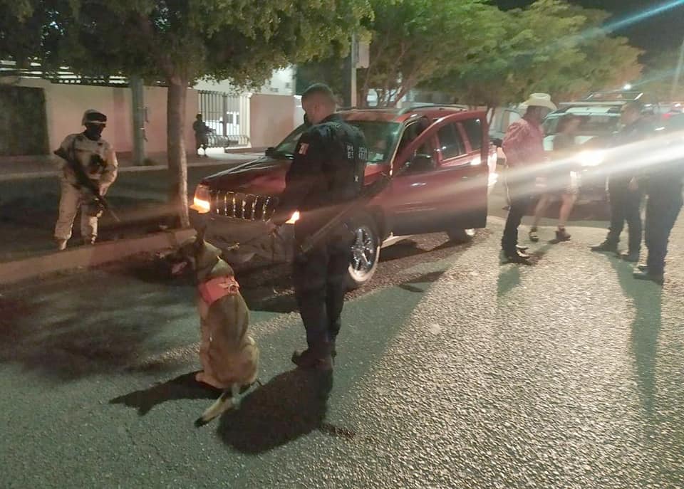 Cajeme, Sonora; mayo 5 de 2021. Con apoyo de las unidades caninas de la Policía Estatal de Seguridad Pública (PESP) y de fuerzas armadas federales se refuerzan los operativos y patrullajes de vigilancia en Cajeme.