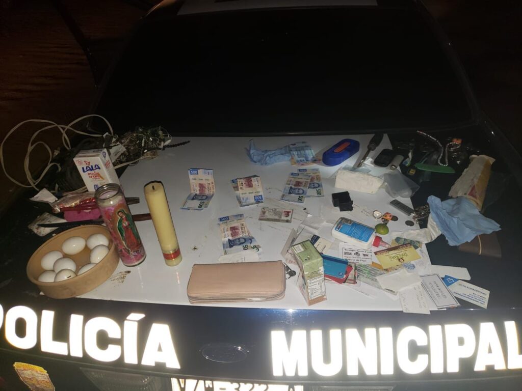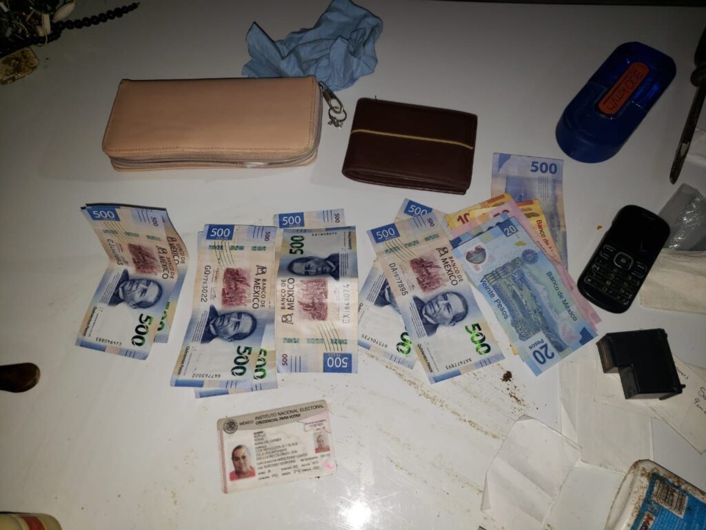 Asegurando en su posesión dos carteras similares a las señaladas por el reportante, las cuales contenían en su interior varias tarjetas de crédito e identificaciones, un teléfono y la cantidad de 4 mil 840 pesos en efectivo y herramienta variada.