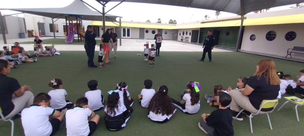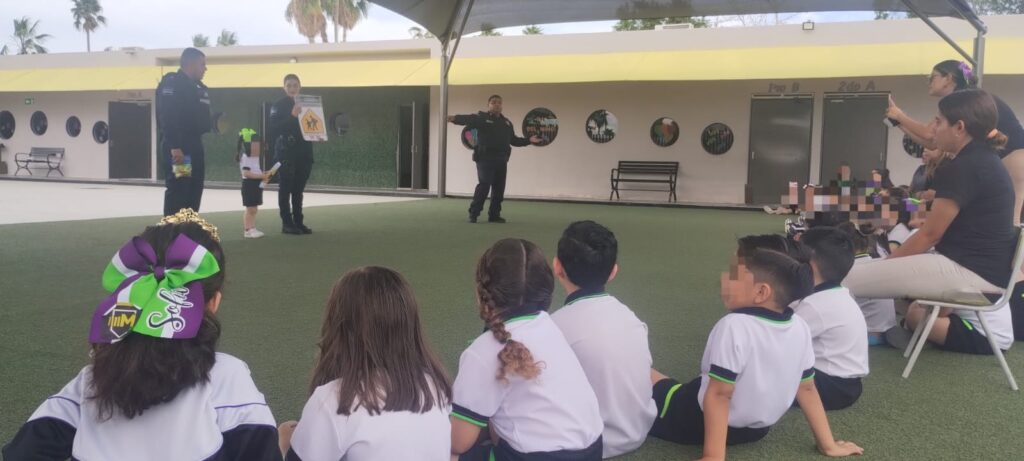 San Luis Río Colorado, Sonora (Abril 18 del 2024).- La Dirección de Seguridad Pública Municipal informa que oficiales de la Unidad de Proximidad Social y Prevención del Delito, interactuaron con infantes del preescolar y maestros en temas preventivos de tránsito,