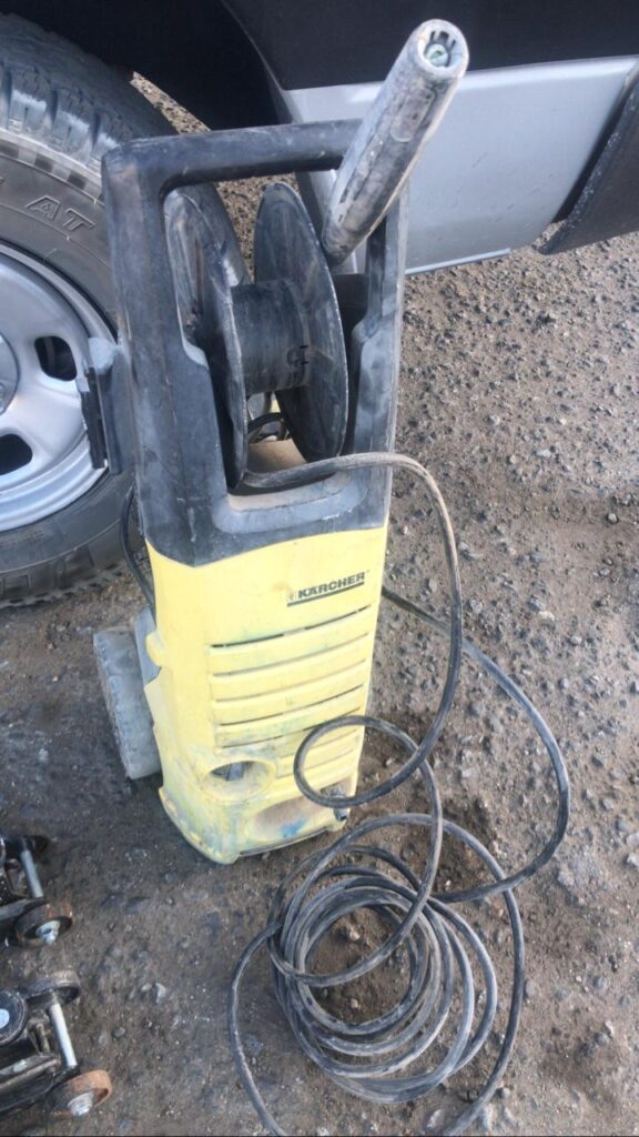 Es así como se le sorprendió cargando dos gatos hidráulicos tipo lagarto y jalando además una lavadora de presión.
